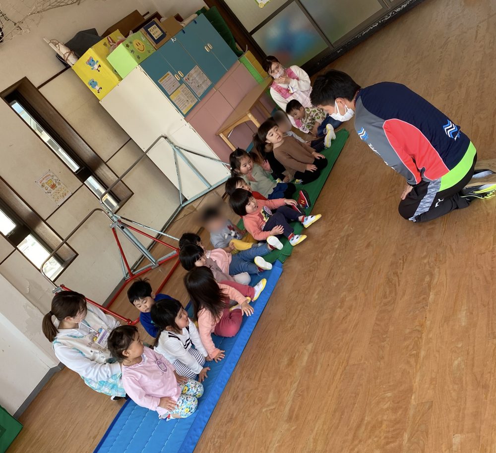 すみれ組になると月1回、橋本先生との運動あそびがあります!この日は進級して初めての運動あそび♪ 「よろしくお願いします!」と元気よくごあいさつをしてから始まります。 一人一人名前を呼ばれると、先生とタッチゲームをしたり、