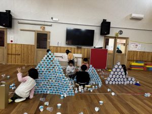 今回のみんなであそぼうは製作遊びとカップ遊びを行いました!!友達と協力し合いカップを高く積み上げて何度倒れても集中して頑張る子。