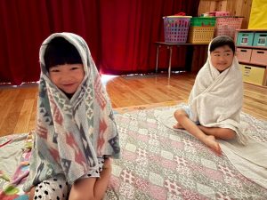 おはよう!6時にはほとんどの子が起きていて、タオルを巻いて遊んでいました〜♬