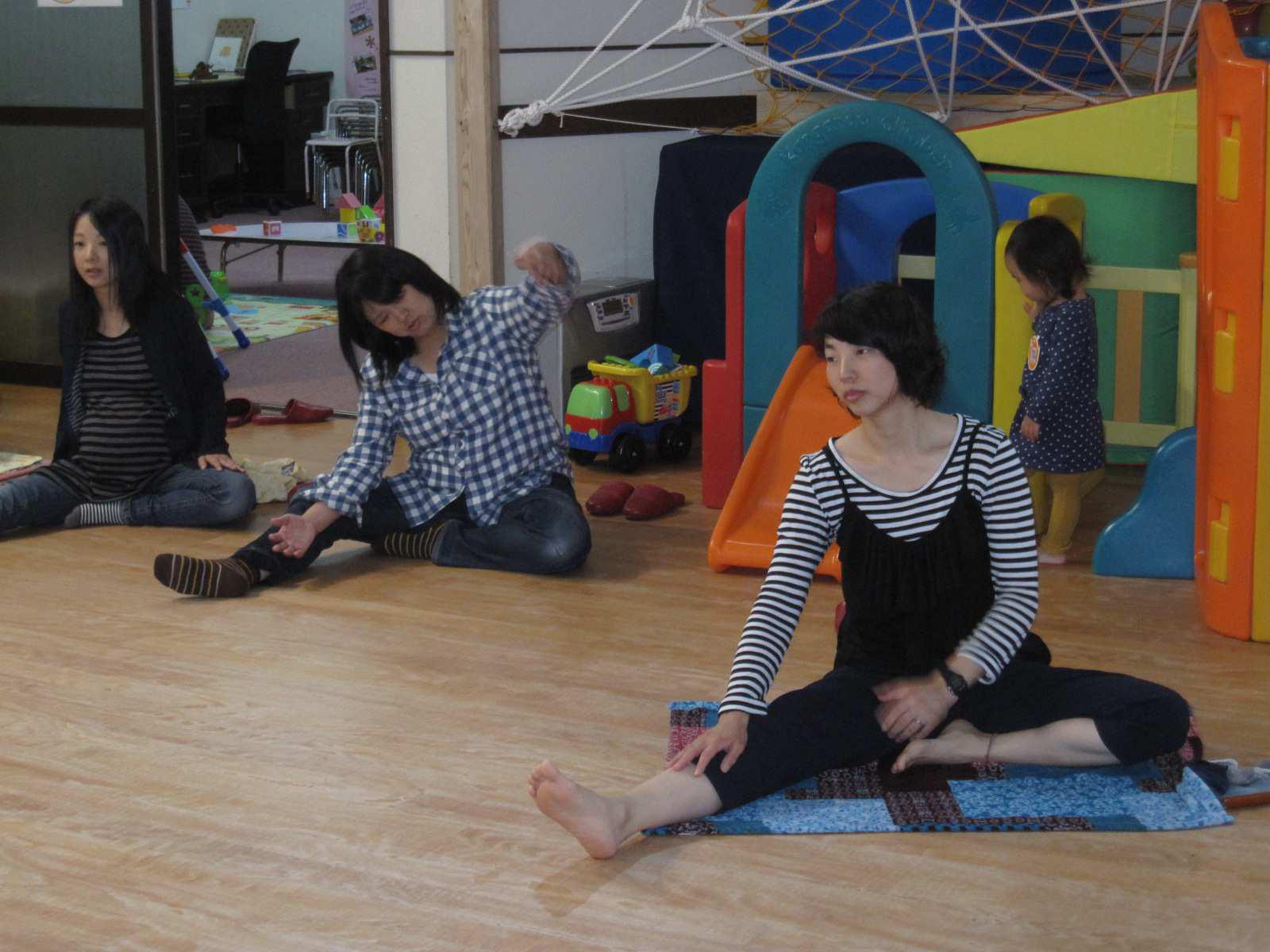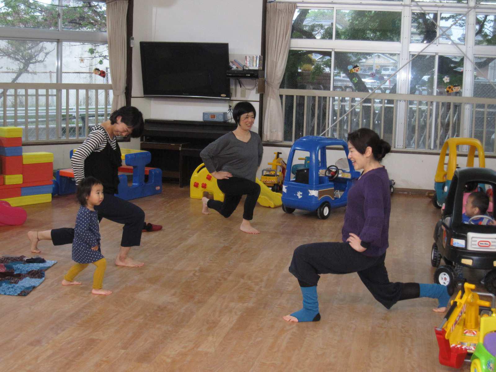 講師の先生の動きに合わせて、ママがやっている隣で、子どもたちも一緒に真似してやっています。