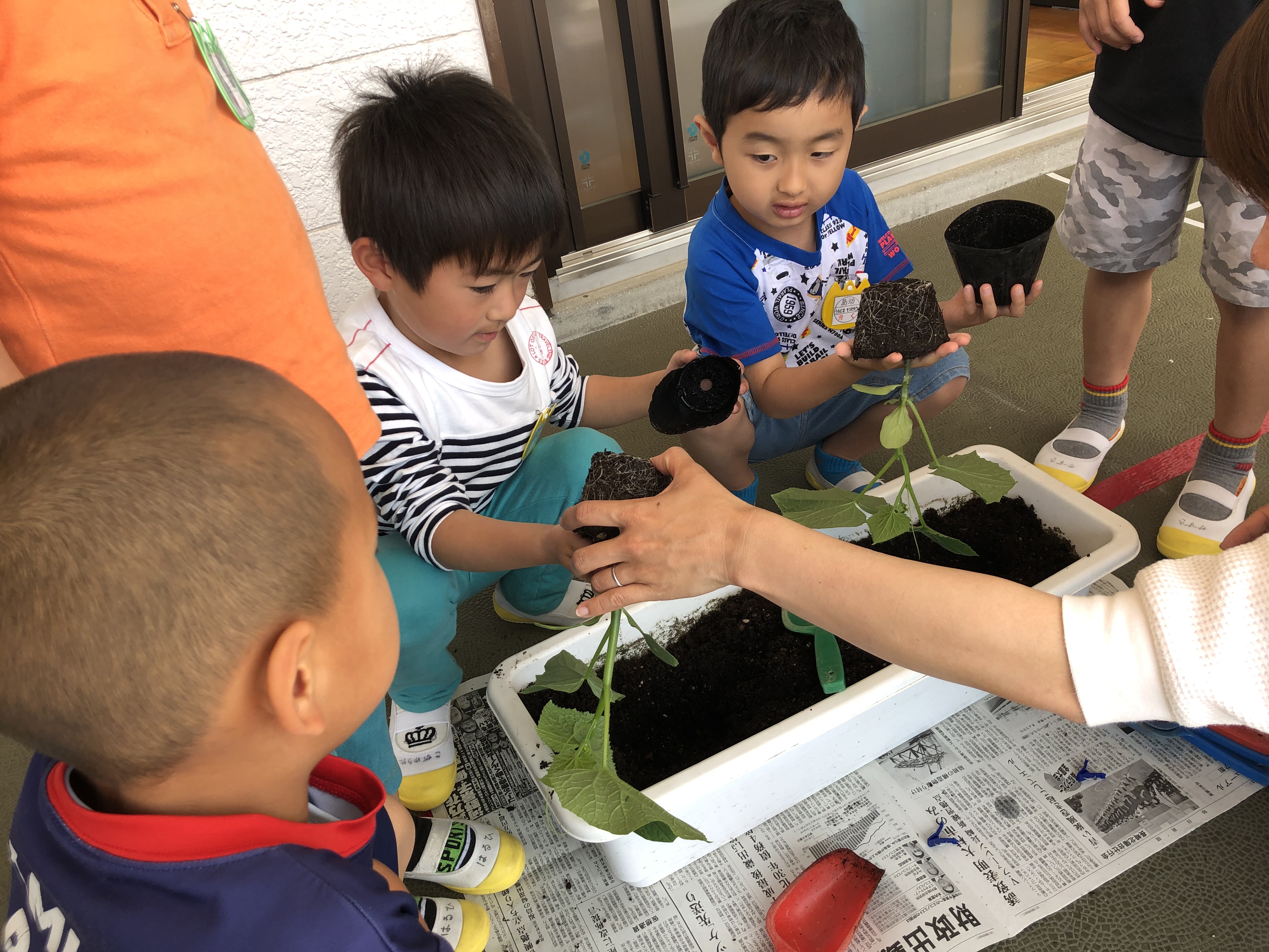 土に穴を掘り、苗をそ〜っと優しく置いて、土をかぶせて、、、