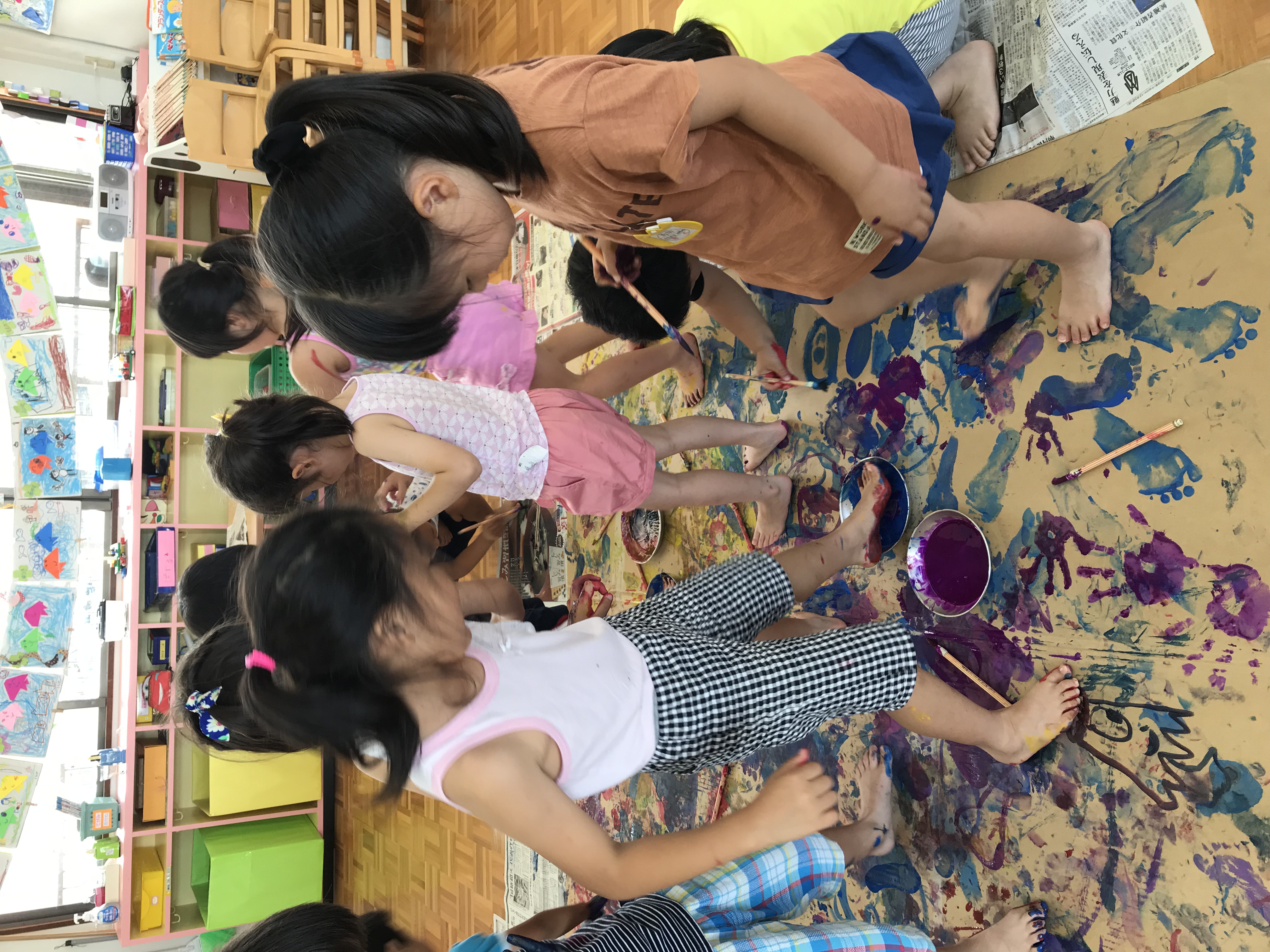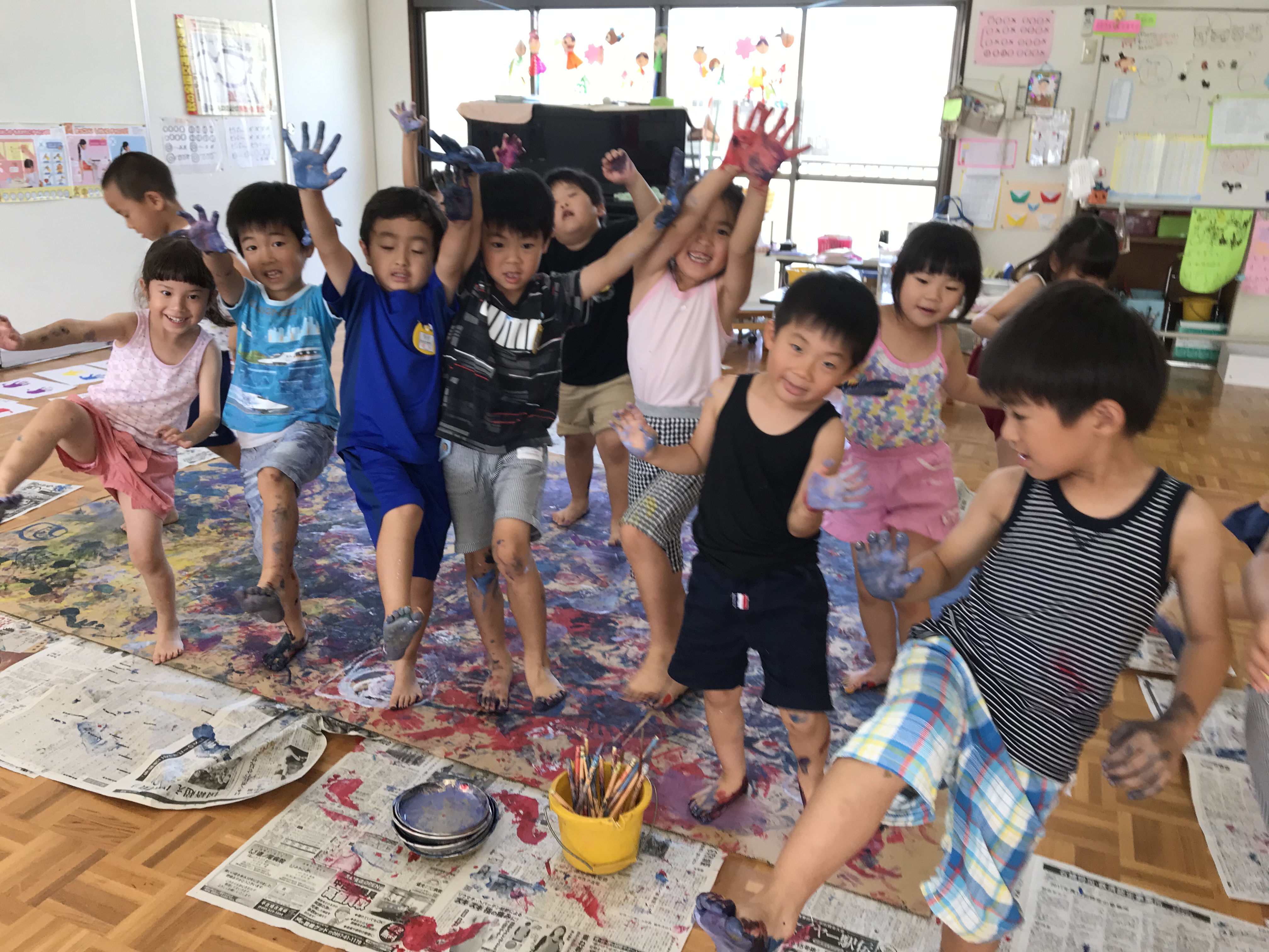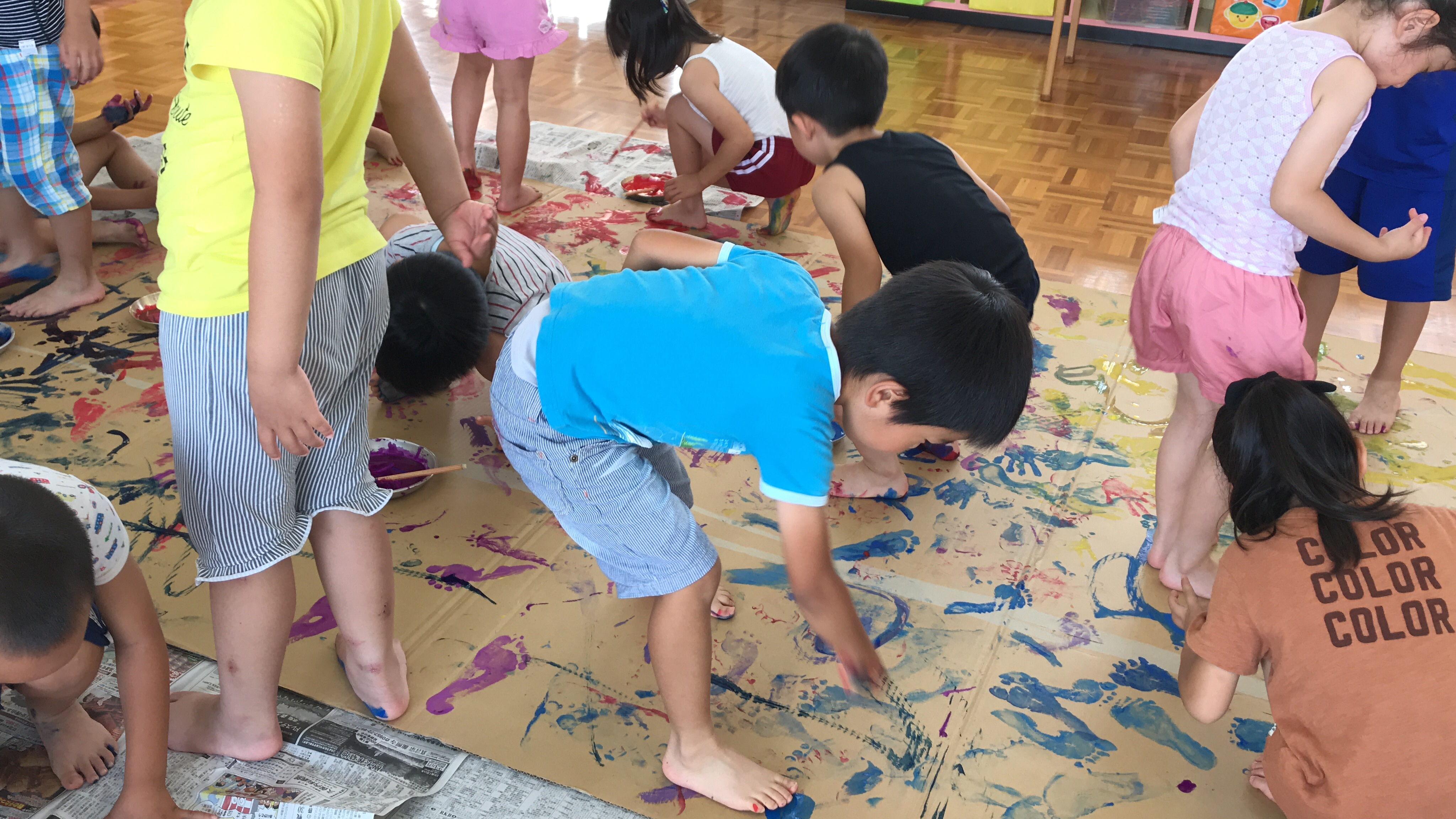 手形を取ったり、大きなダンボールの上で絵の具を混ぜたり、おばけを描いたりと、子供達は思いっきり楽しんでいました??