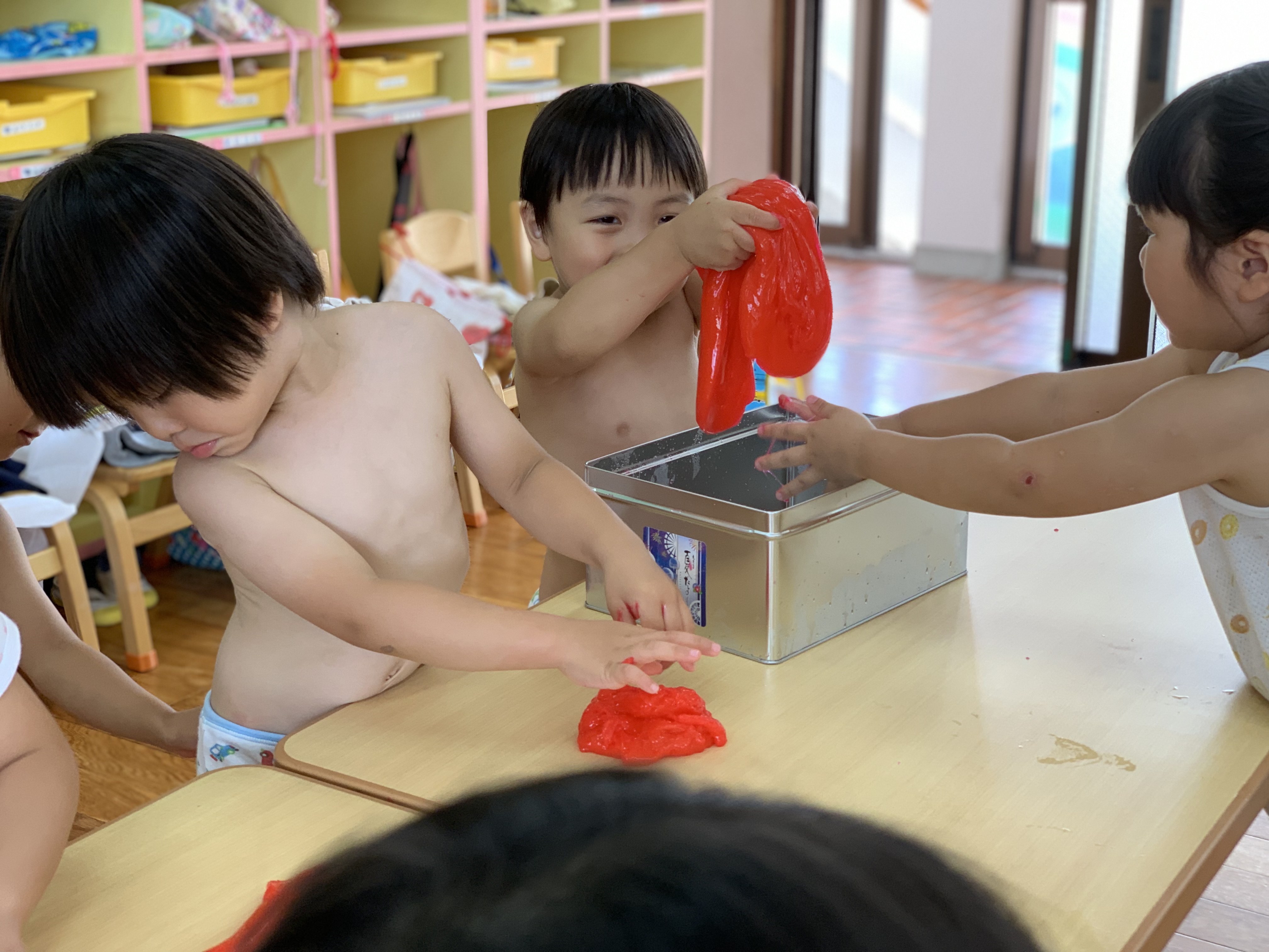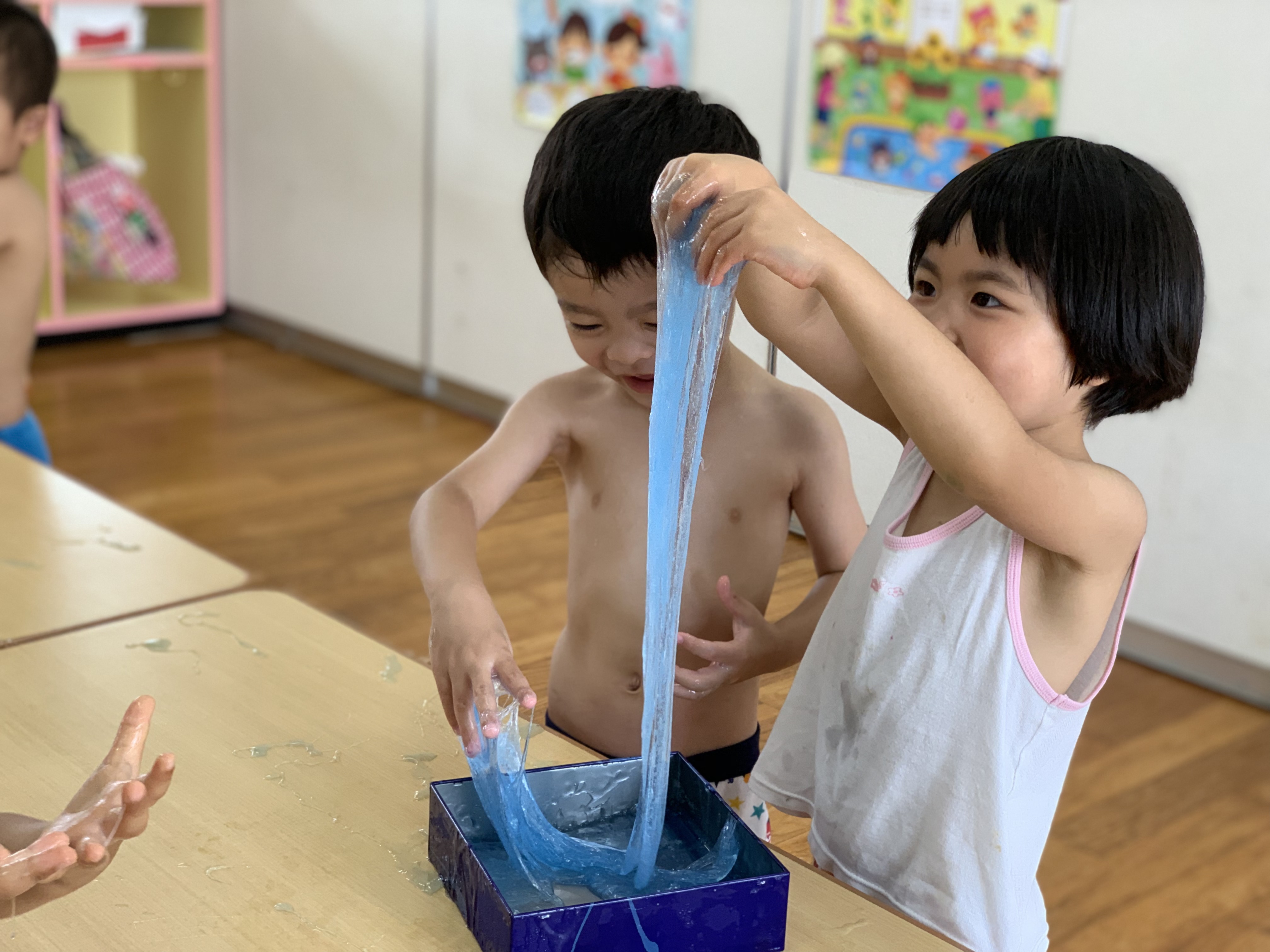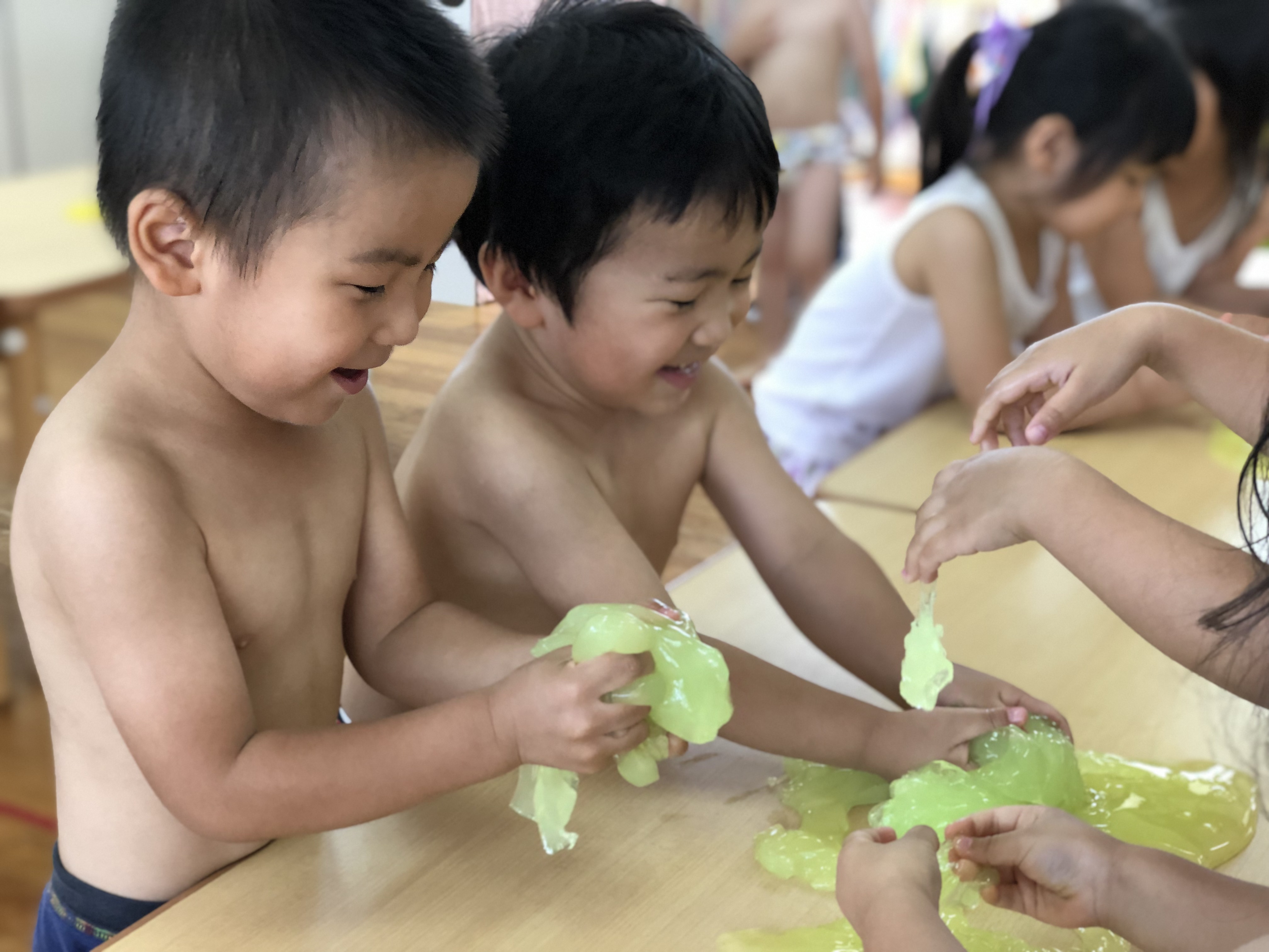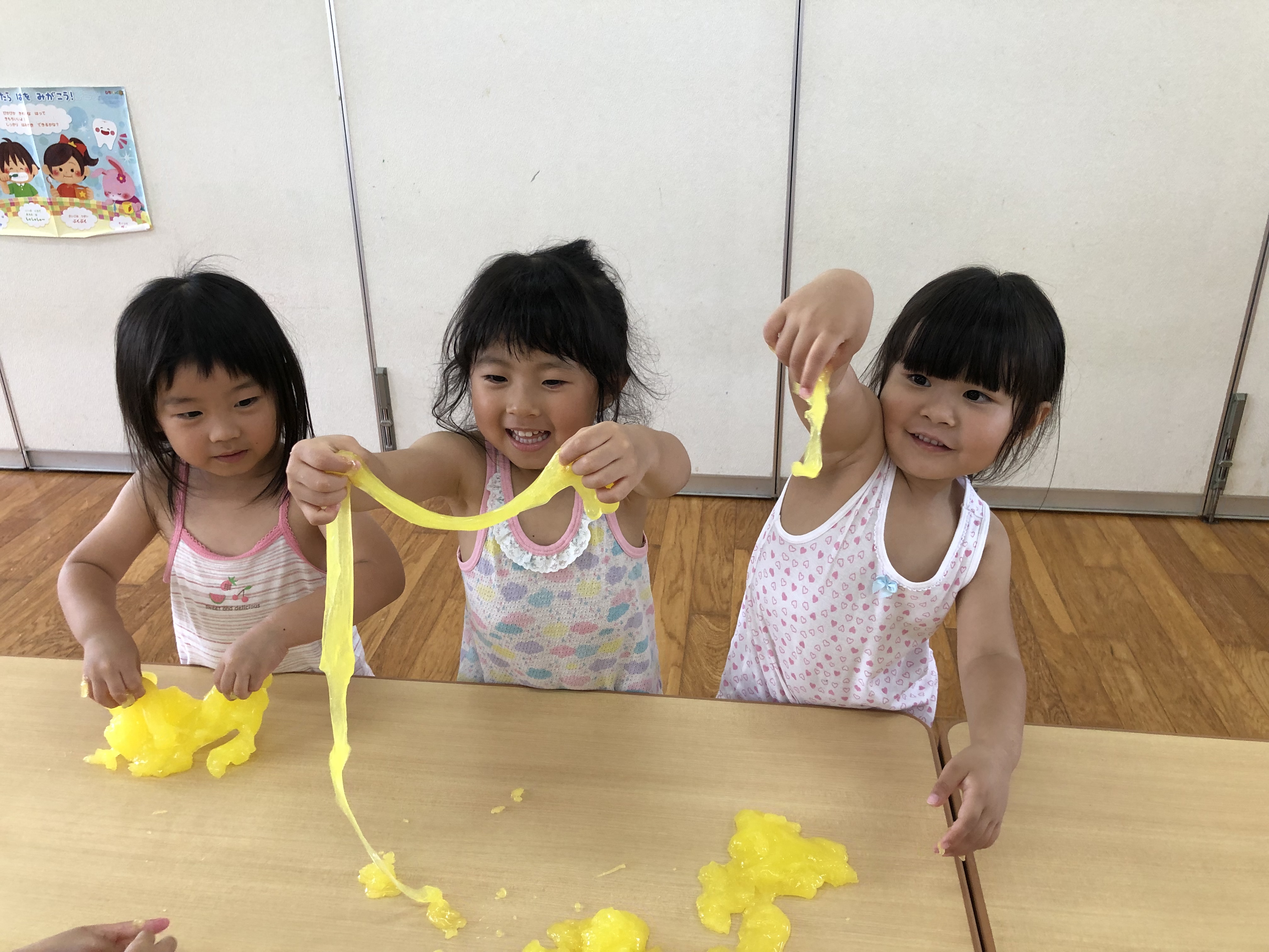 12 7月2019 0 年少 スライムあそびをしました★ 子ども達の様子 年少うめ・もも組ではスライムを使って遊びました! 黄色・赤・黄緑・青、、、 綺麗な色のスライムに、子ども達も大興奮? ペチャペチャ握ってみたり、ビヨーンと伸ばしてみたりと、 スライムの感触を楽しんでいました?? また遊びましょうね?♪