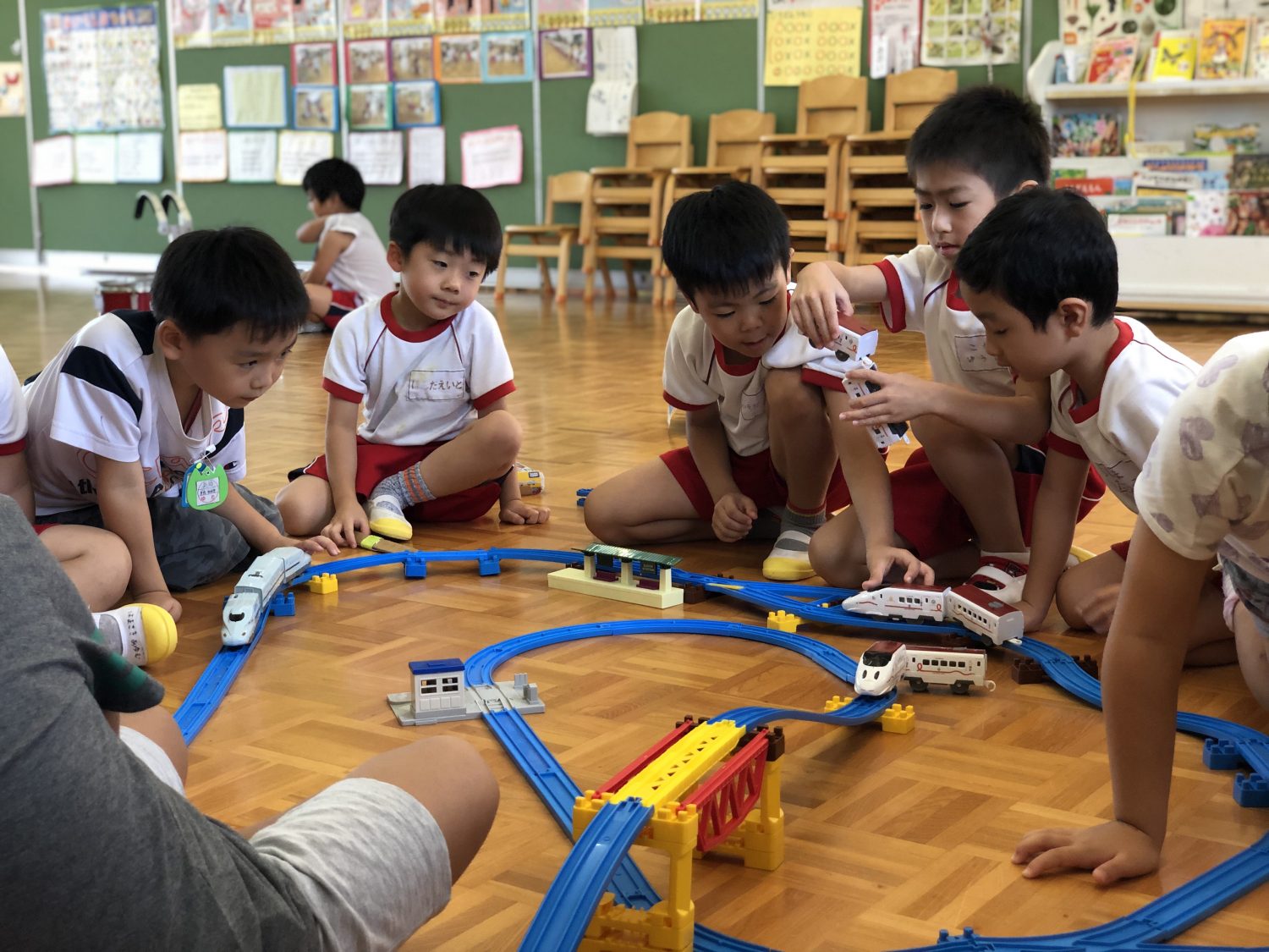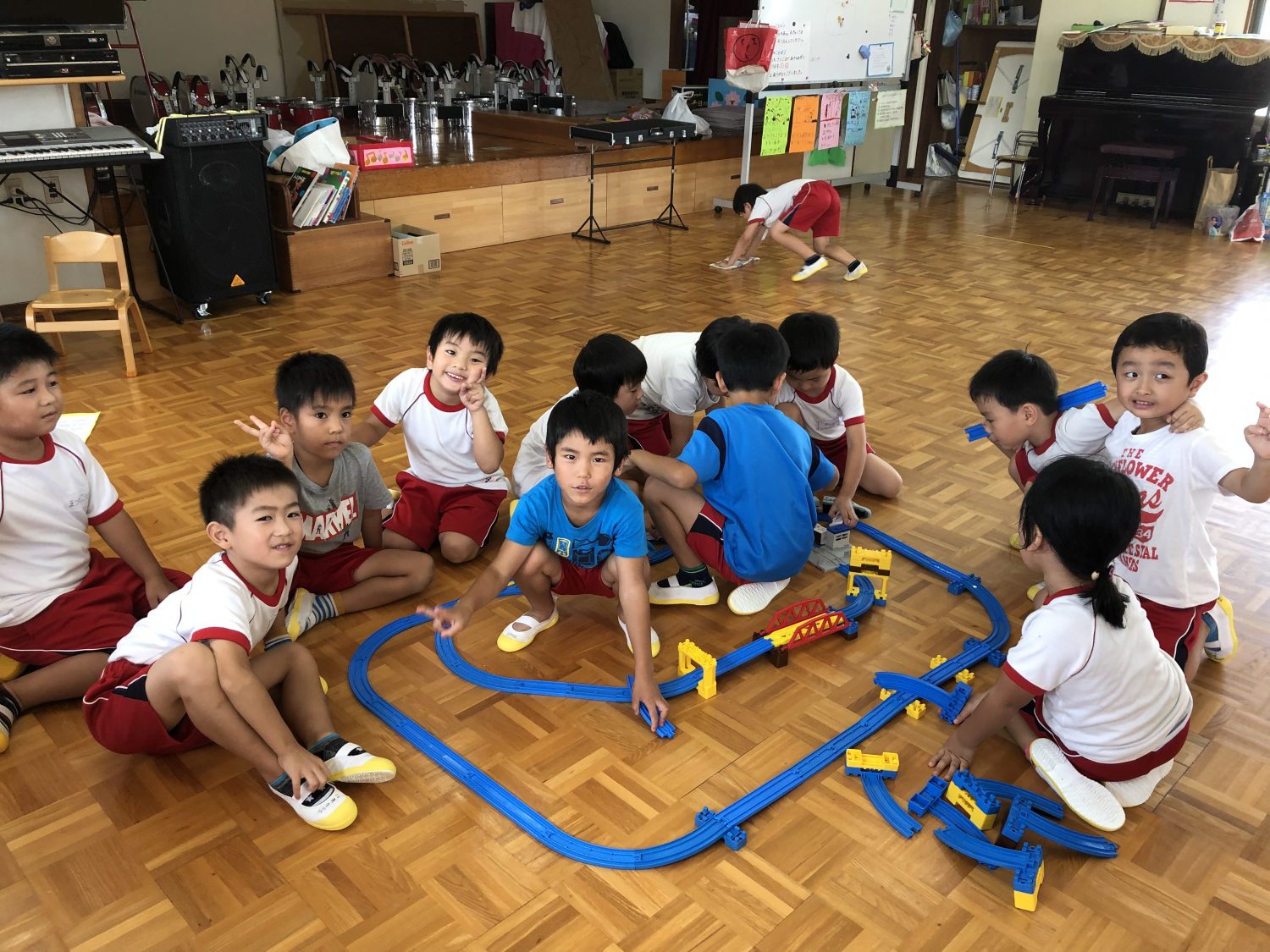 最近の年長さんは、男の子はプラレールに夢中になっていて、毎日違うレールの道が出来ていて面白いです!
