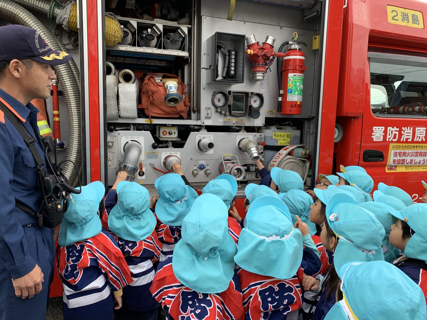 『消防車の中には何が入ってますか?』という質問をして、消防車の中の見学をしたり、『これはなに〜?』と興味津々でした♪