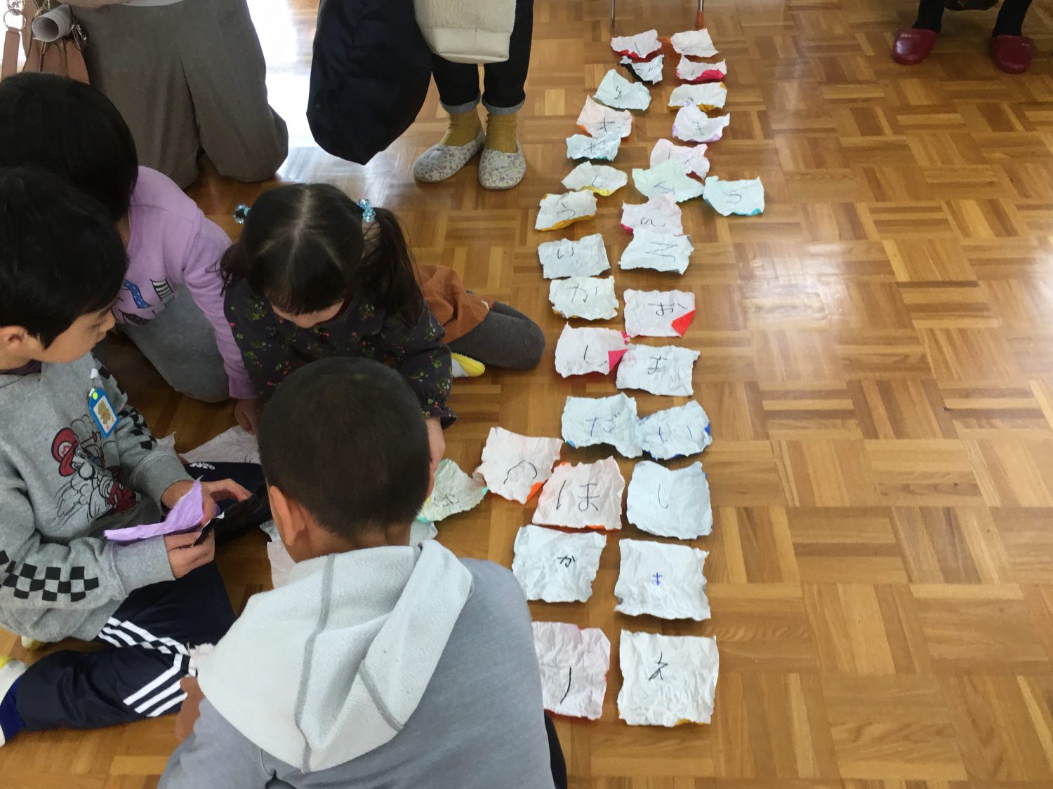 年長さんは、お母さん達と一緒に、隠れてる文字をさがして、言葉を繋げて遊びました。