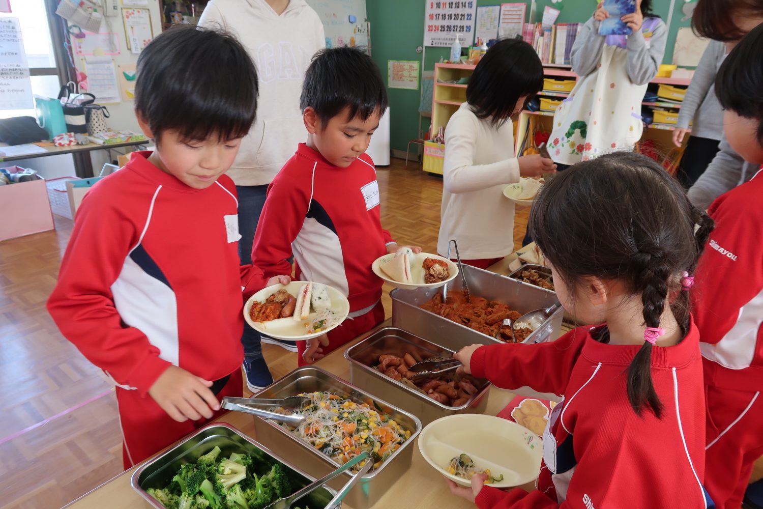 まずは、給食の先生からお話があり、バランスよくお皿に乗せることや食べれるだけ取るという約束をしました。