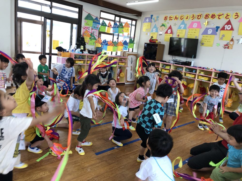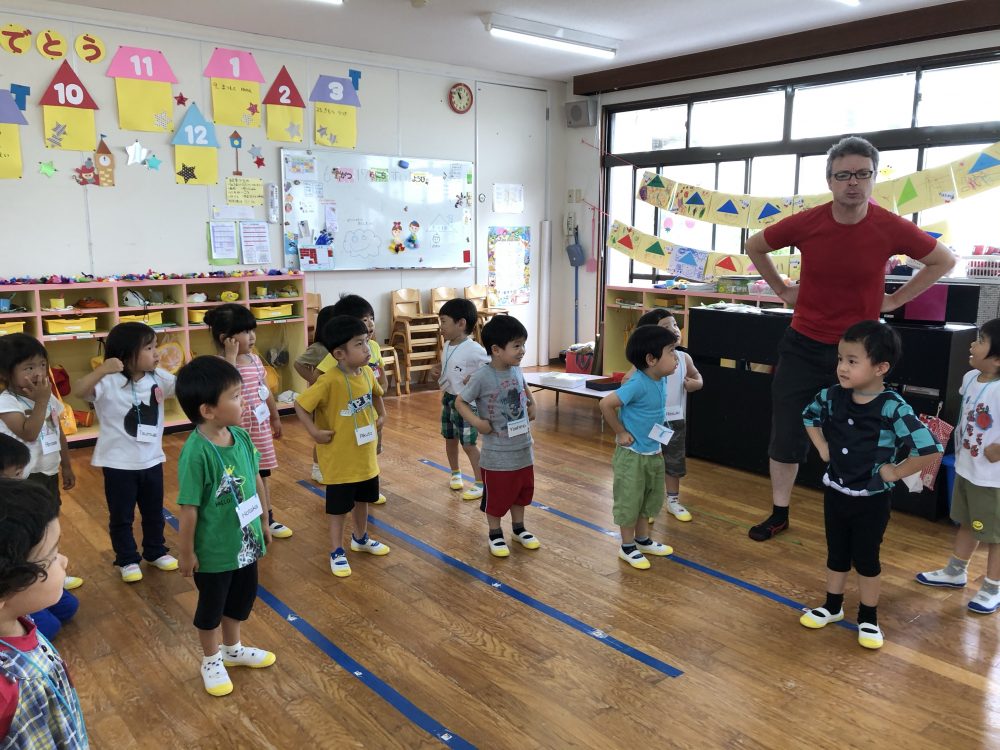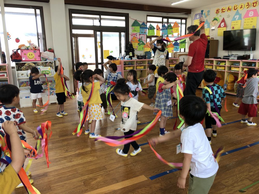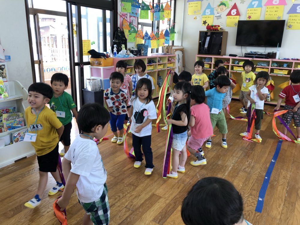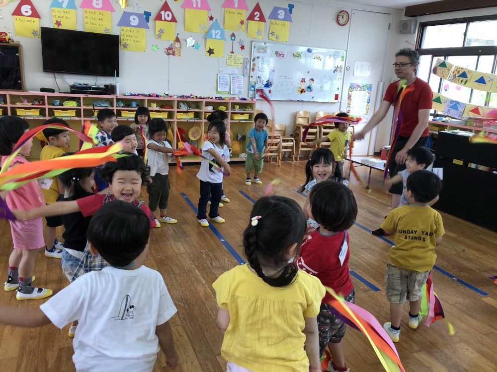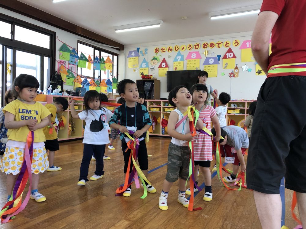 19 6月2020 0 年少?えいごであそぼう お知らせ 月に2回のアラン先生のえいごであそぼうを楽しんでいます!! まずは歌や簡単な英単語を言いながら、なりきって表現あそびを楽しんでいます? 最後にはバルーンやカラフルなリボンを使って体を動かし、子供たちも大喜びでした?