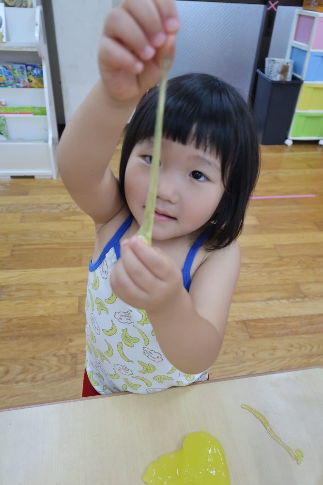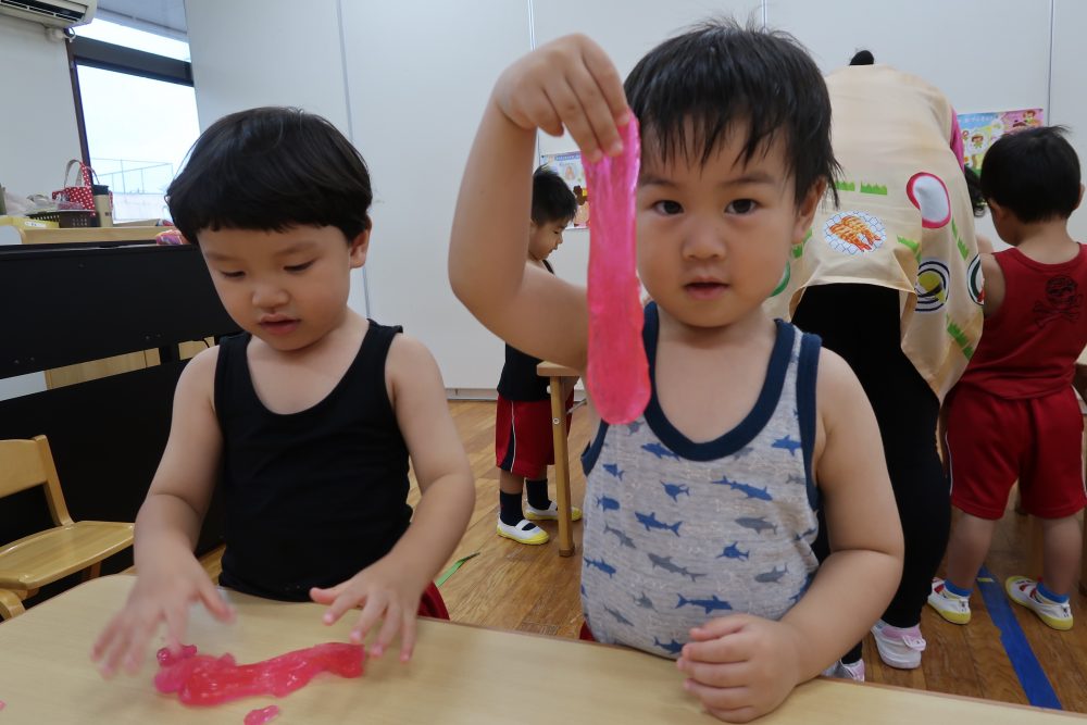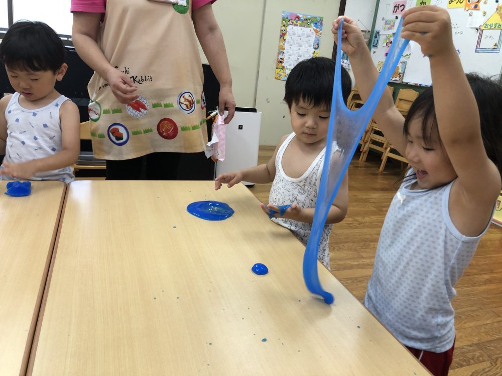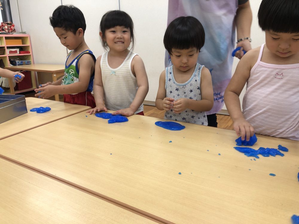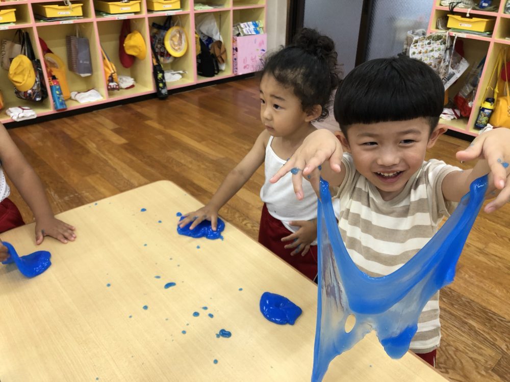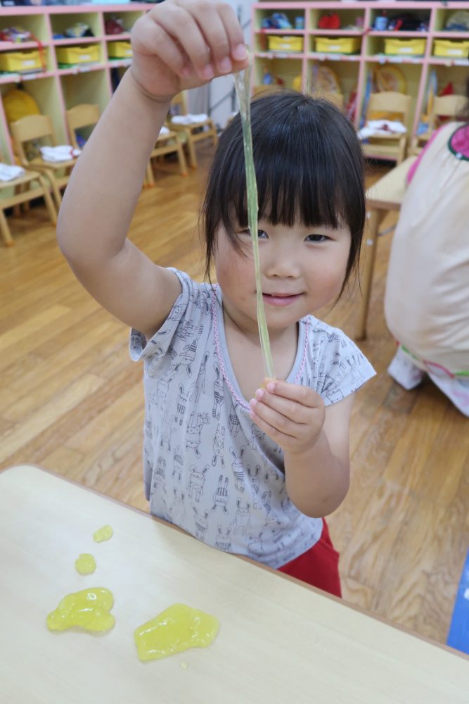 09 7月2020 0 年少 スライム遊び⭐️ お知らせ 7日(火)はスライム遊びをしました? 初めて見る・触る子がいてみんな興味深々! 初めて触る子もいましたが、触ってみると「気持ちいい~」「冷た〜い❄️」「ぷにぷにしてる!」と大喜びでした? 慣れてくると上手に伸ばして楽しんでいました!