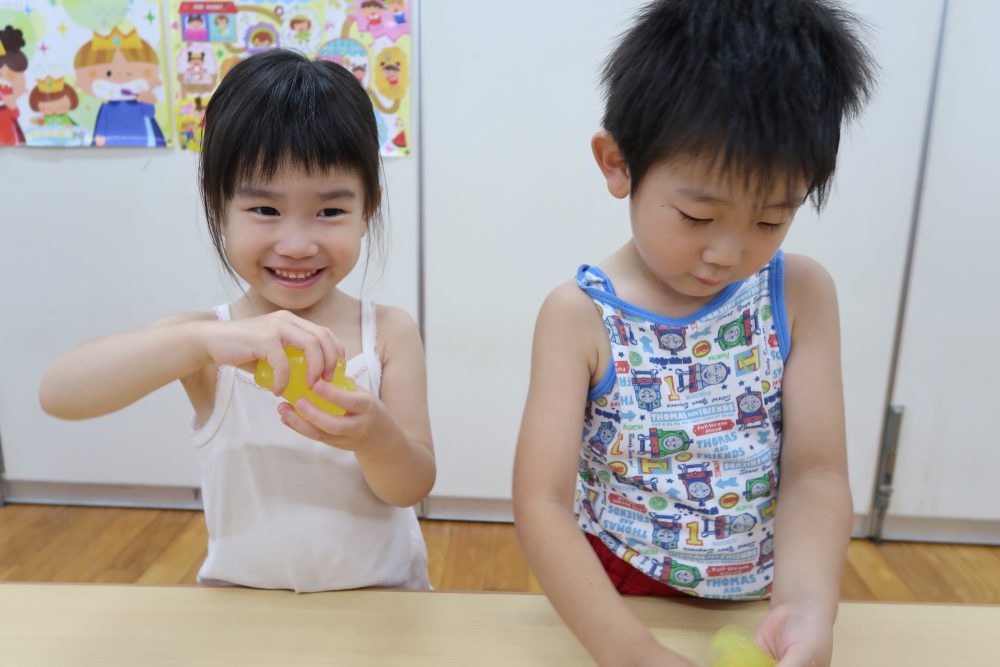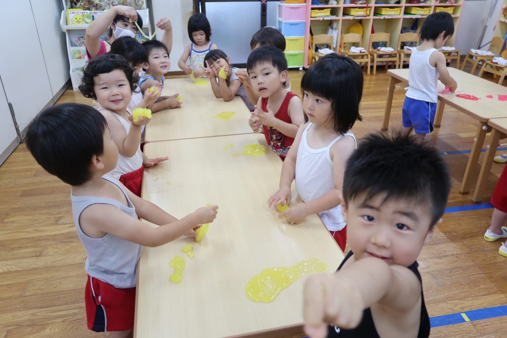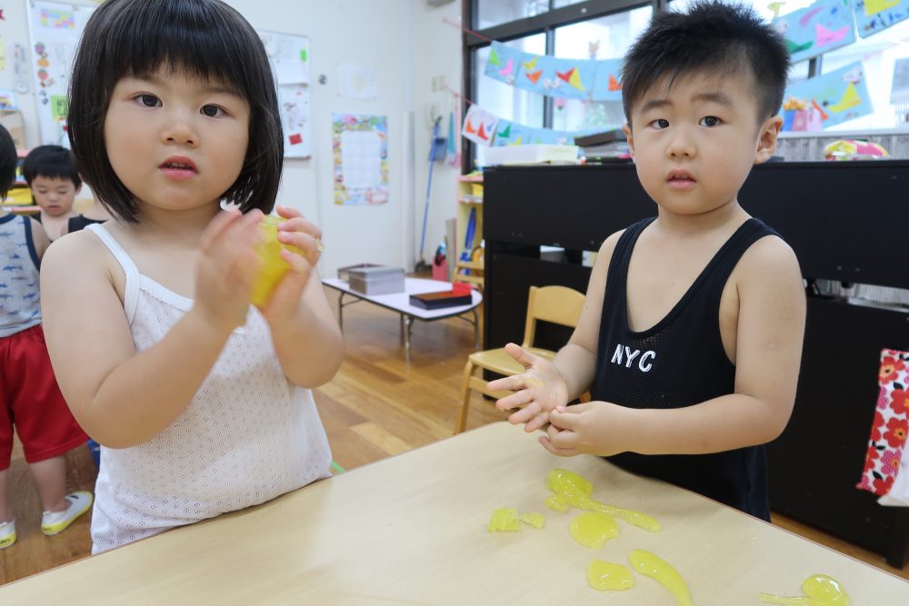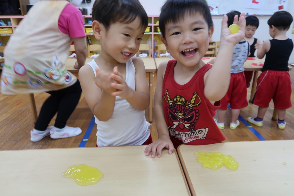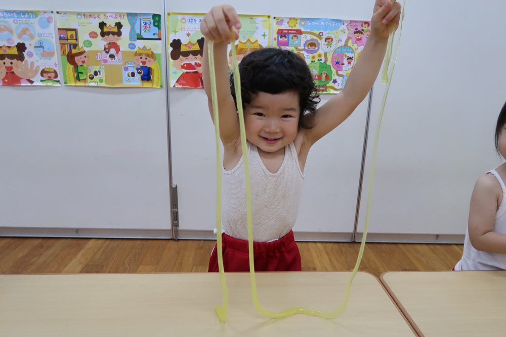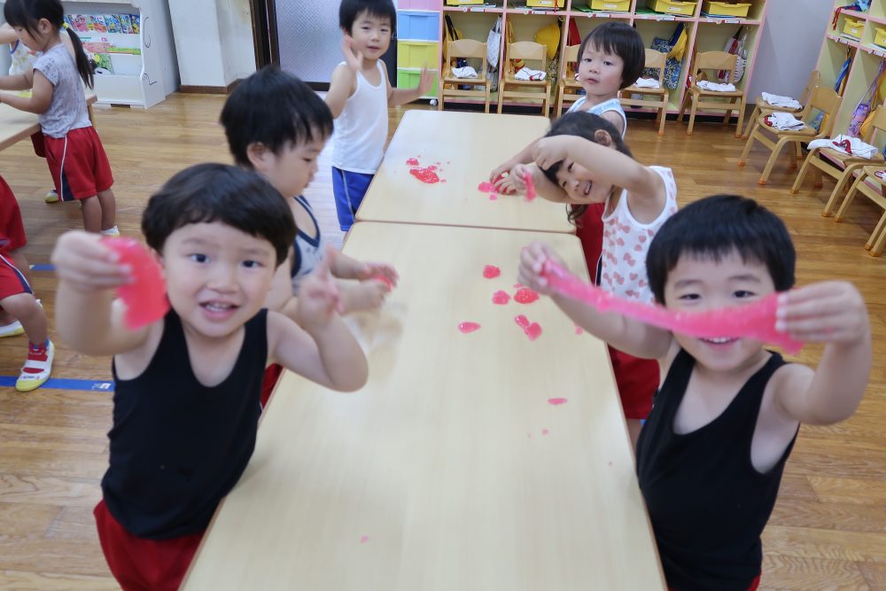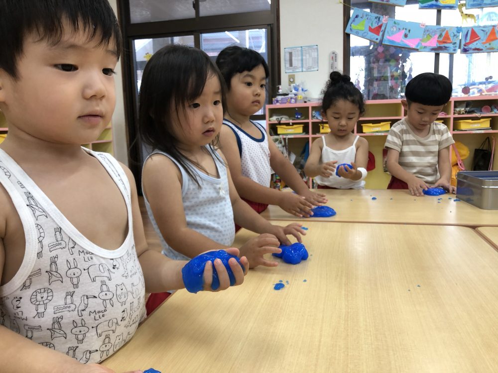 09 7月2020 0 年少 スライム遊び⭐️ お知らせ 7日(火)はスライム遊びをしました? 初めて見る・触る子がいてみんな興味深々! 初めて触る子もいましたが、触ってみると「気持ちいい~」「冷た〜い❄️」「ぷにぷにしてる!」と大喜びでした? 慣れてくると上手に伸ばして楽しんでいました!