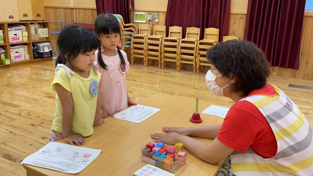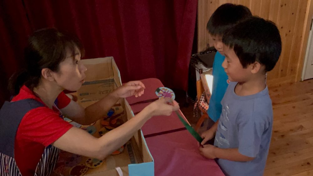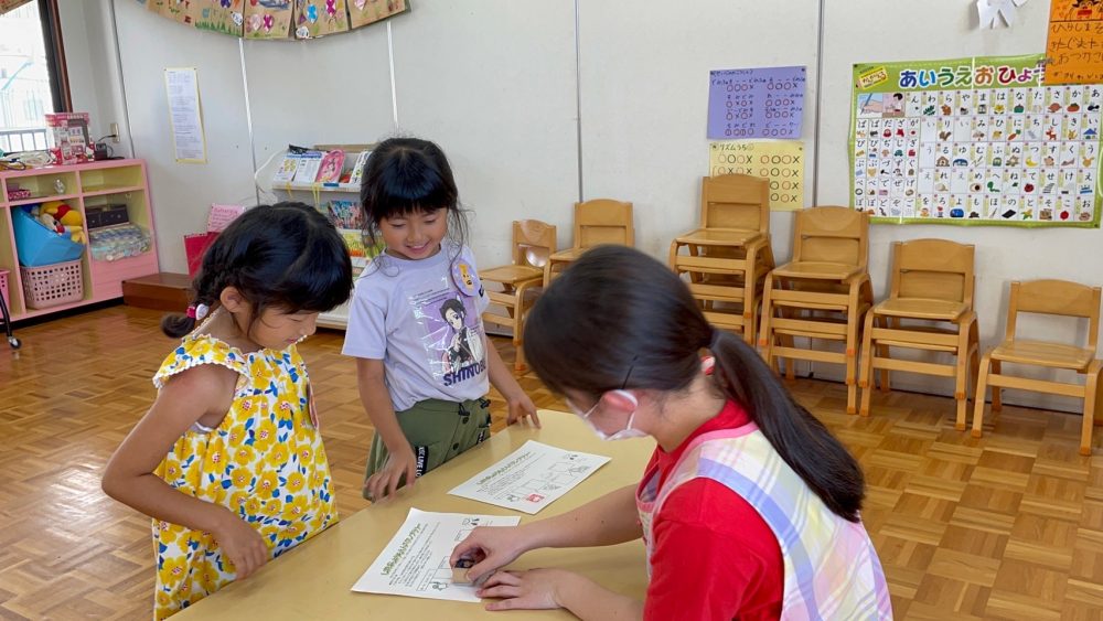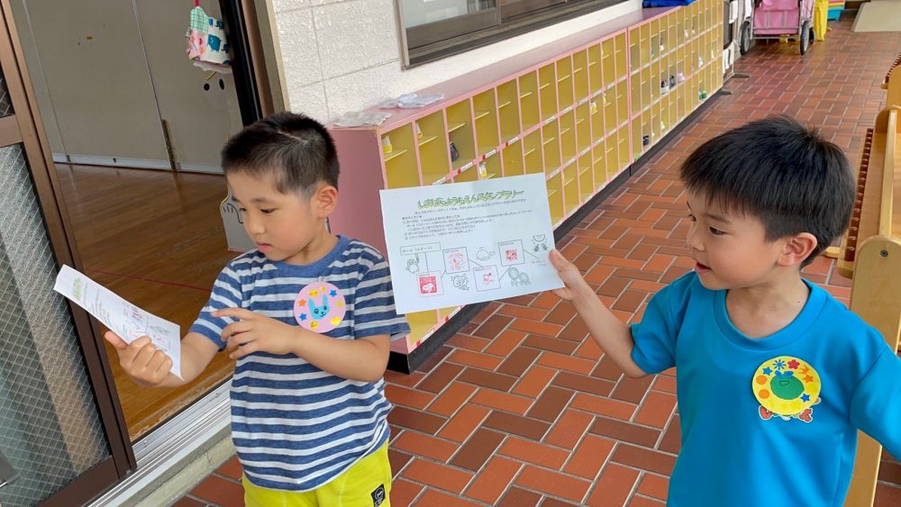 スタンプラリーでは、いろんな先生たちが待つお部屋をまわり、幼稚園についてのクイズを考える子どもたち。