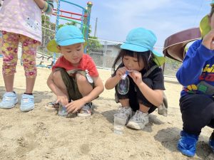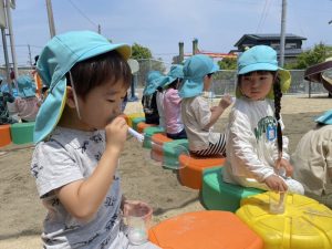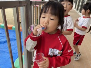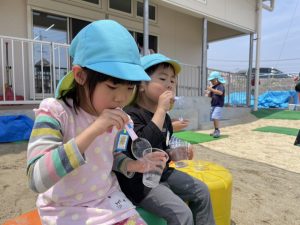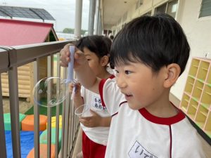 22 5月2023 0 年中🫧シャボン玉をしました! 子ども達の様子 晴れた日に、みんなで園庭に出てシャボン玉を飛ばしました🫧 ふーっと優しく息を吹いて、上手に膨らませることが出来ました✨ 雨の日も、屋根付きの通路で遊んでいます🎶