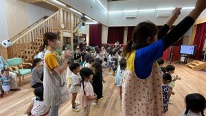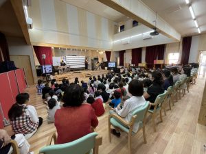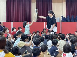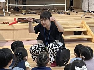楽器の紹介、体験や、音符♪音階あてクイズ、最後は「どんぶりずむ体操」を教えていただき、リズムに合わせて、楽しく体を動かしとても楽しいコンサートでした。