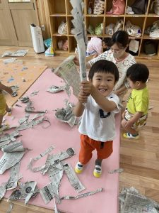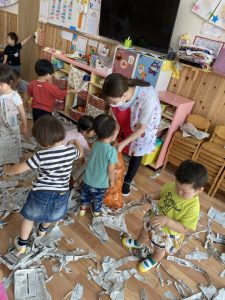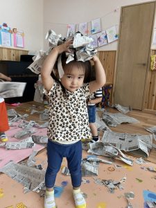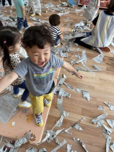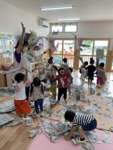 この間は新聞紙遊びでお部屋中新聞紙だらけになって思い切り遊びました☆新聞紙の雪が降るとみんな大喜び🎵