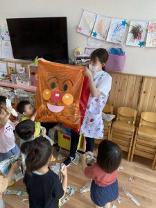 お片付けも遊びの中に取り入れて☆大きなアンパンマンの袋の中にみんなで床に落ちているたくさんの新聞紙を集めました!