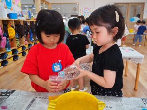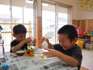 好きなお花を選んで🌼お友達に水を入れてもらって、すり鉢や袋で潰します。キッチンペーパーで漉すと〜…