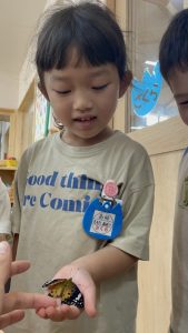 うまく羽化できず、羽が曲がって飛べないチョウもいましたが、肩に乗せてみたり手に乗せてみたり…😊