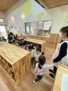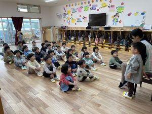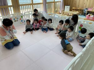 3歳未満の子どもたちは、絵本の読み聞かせや手遊びうたを歌ったり、お返事はーい‼️の後は大好きなアンパンマンにタッチをして、親しみを感じながら少しずつ涙も少なくなってきました