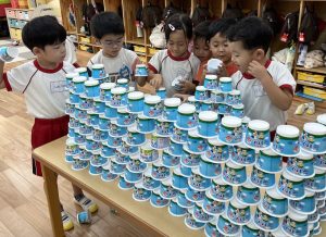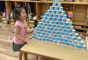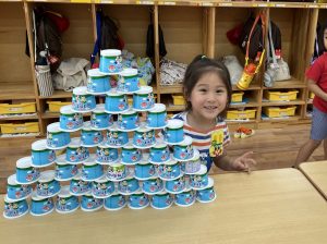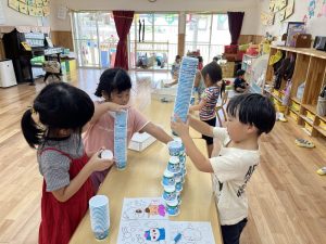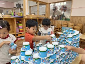 この日からさくら組では、ヨーグルトカップを積み上げる遊びが流行っています!