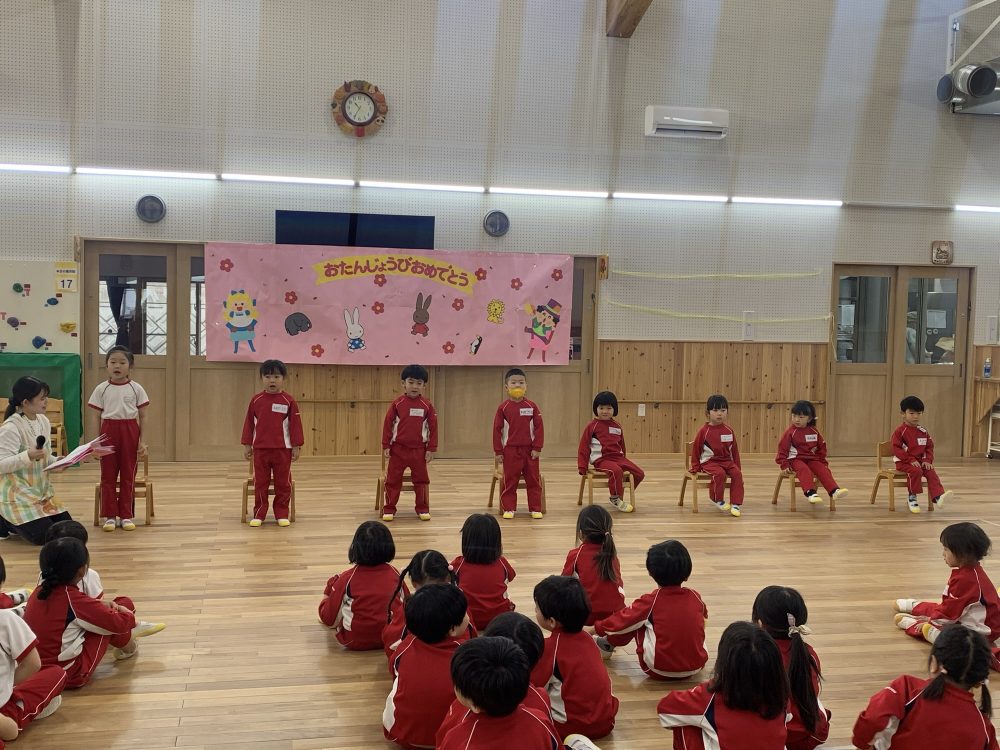 1月15日、12月・1月生まれのお誕生日会が開かれました。年長さん1名、年中さん3名、年少さん4名をお祝いしました。 ちょっと恥ずかしいお友だちもいましたが、先生と一緒に頑張って発表できました。大きくなったら、なりたいも