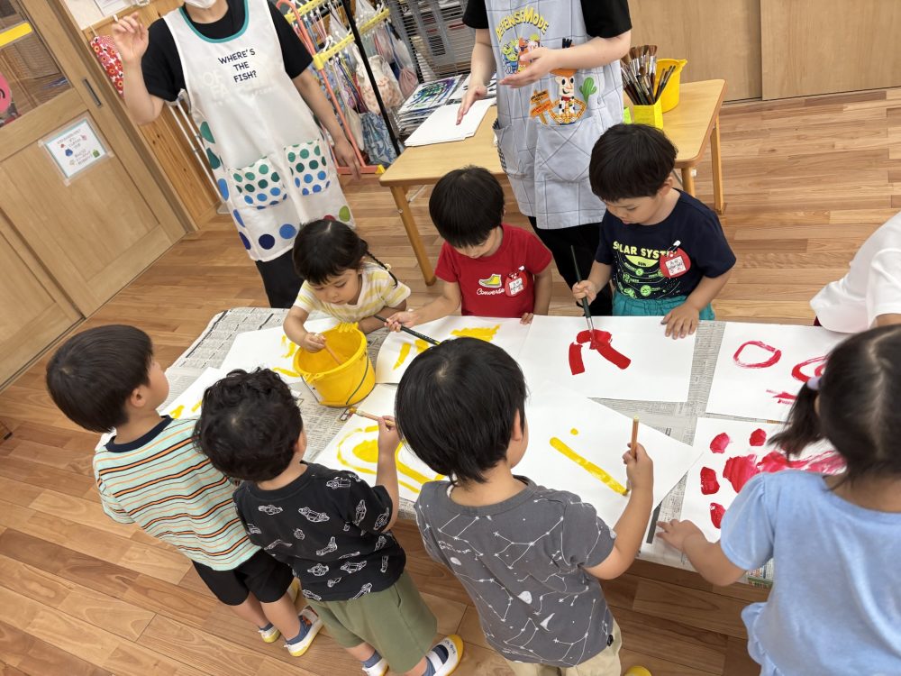 今日はみんなが楽しみにしていた絵の具遊びをしました😊以前絵の具スタンプをしましたが、今日は筆を使いました😊 まずは先生の説明を興味津々に聞いています🙂 早速自由に描き始めました✨ 今日は6色の絵の具を使って紙いっぱいにお