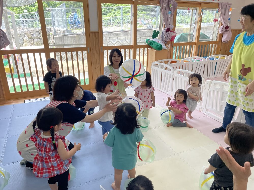 先日、打楽器であそぼうがありました! 「なにをするんだろう?」とワクワクしながら子ども達はサオリーヌ先生の話を真剣に聞いています☺️ 風船で作ったバチが出てくると、一斉に近付いていく子ども達。 さっそく風船のバチを持って
