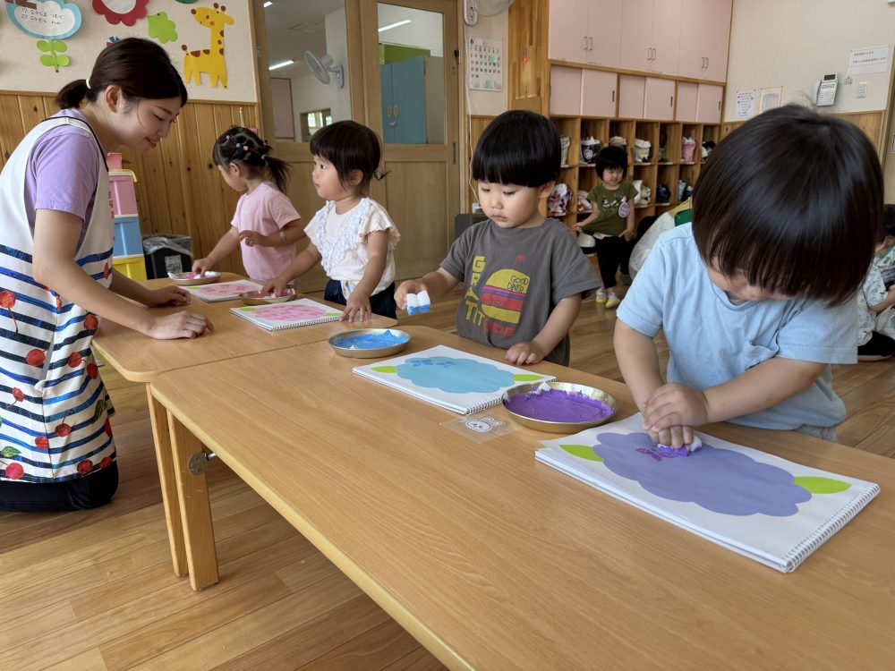 6月17日 スタンピングをしました😊 説明で絵の具を見せるとワクワクした顔で覗き込む子どもたち🤩 ピンク・水色・紫の紫陽花をスタンピングで作りました❁⃘*.゚ 力を込めてギューッとスタンプする子ども達は 絵の具で花の形が