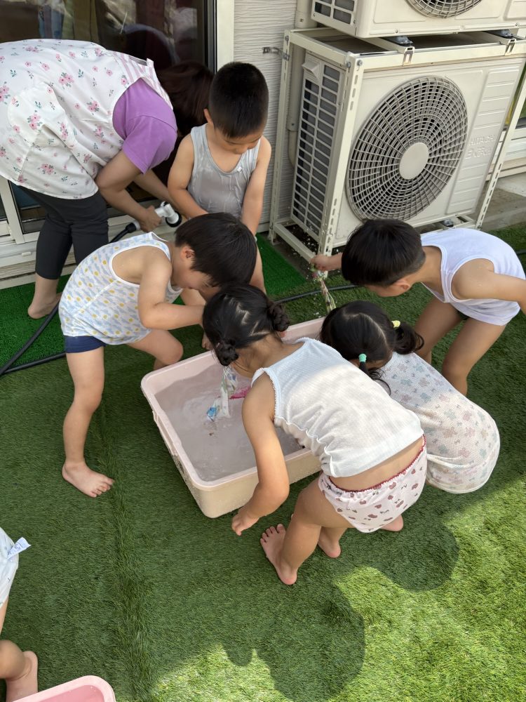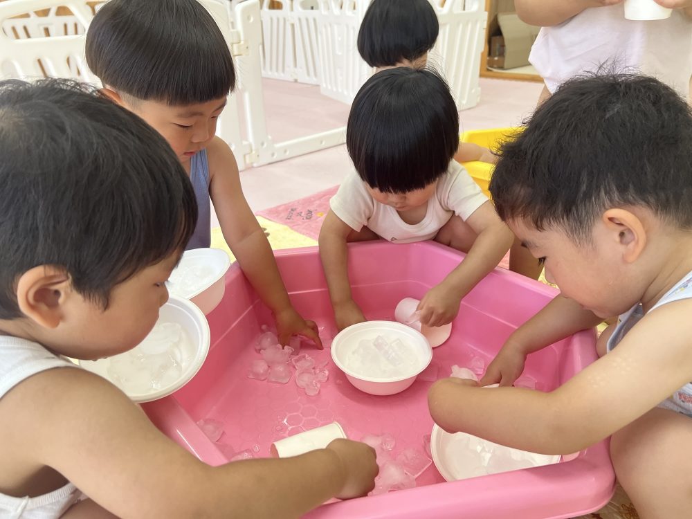 暑い日が続き、水遊びが楽しい時期になってきましたね🙂そこで今日は、みんなでせんたく遊びをしました♬ 自分のハンカチをジャブジャブ⭐︎ゴシゴシ⭐︎ みんなで楽しく洗いました✨ 洗濯機みたいにグルグル回してるお友達もいました