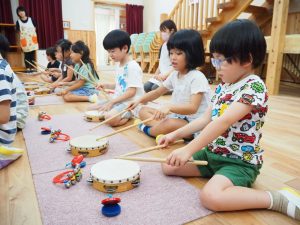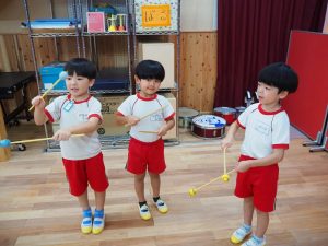 ドラムセットに見立てたタンバリン・スズ・カスタネットを使って、両手で演奏にチャレンジ!!!