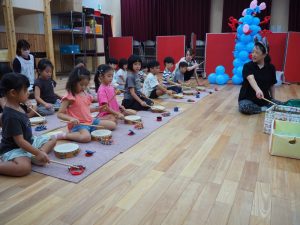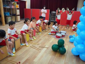 25日は、風船スティックを使って風船や太鼓をたたいて、いつものバチとは違う音を楽しんだり♩