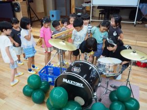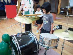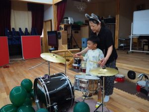 ドラムに興味津々の子どもたちは、早速バスドラムに挑戦👣