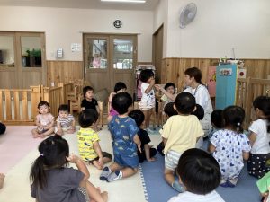 8・9月生まれのお友達はお名前を呼ばれると元気なお返事をして、みんなの前に出てきて誇らしげ😊
