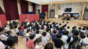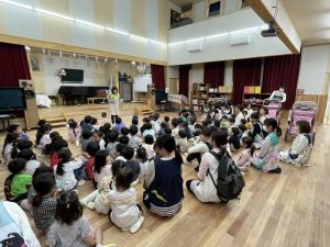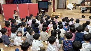 非常ベルに少しびっくりして泣いてしまったお友達もいましたが、避難後の集会では、園長先生からのお話を静かに聴くことができました。